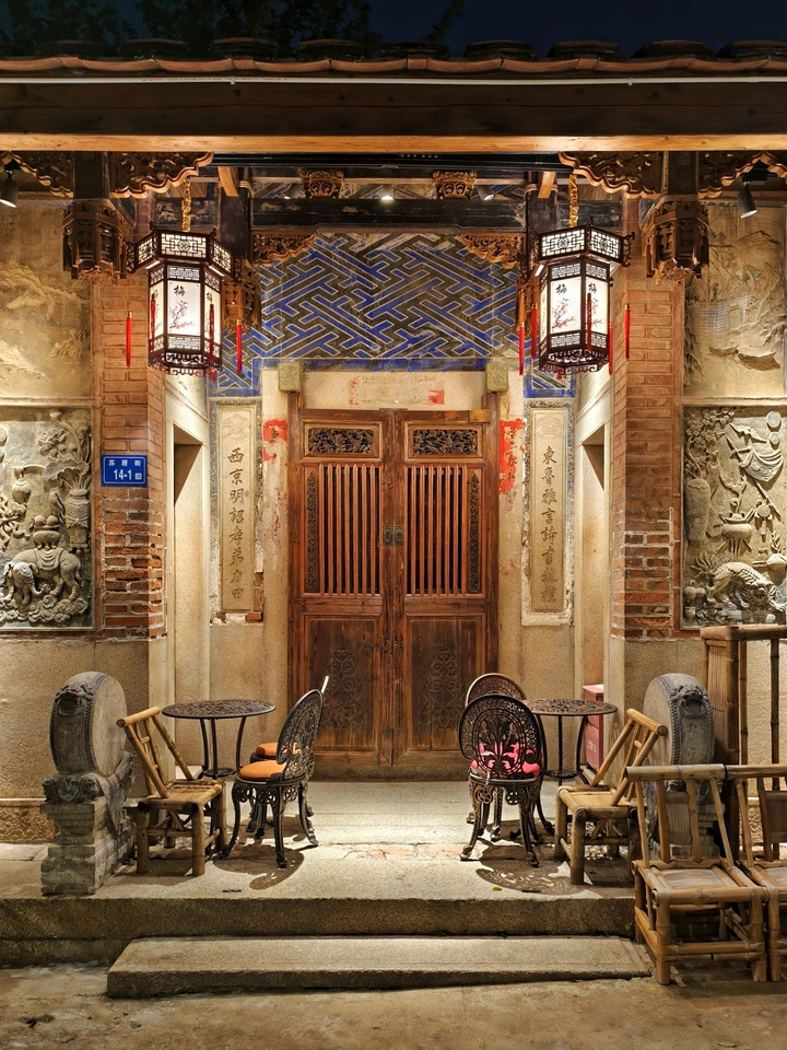 夜色漫过燕尾脊,红灯笼轻晃着旧时光。砖雕上的太平有象,门当处的兽首衔环,还有彩画里晕开的青蓝,都在暖光里慢慢苏醒。竹椅与铁艺桌静立阶前,像在等一场未完的茶话,把闽南古厝的烟火与风雅,都揉进这方寸夜色里。