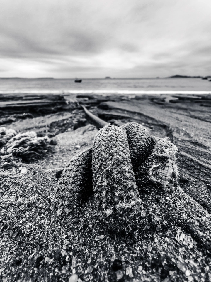 缆绳在滩涂刻下粗粝的诗行,一头系着饱经海风的船,一头拴着岸的沉默。黑白光影里,磨损的纤维、起伏的浪纹,都在诉说着归航与守望的故事。每一次潮起潮落,都是船与岸之间,最古老的约定。