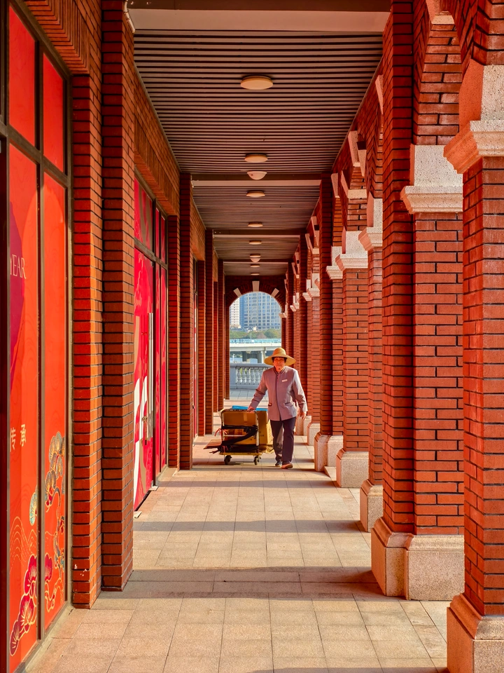 阳光把红砖廊柱的影子拉得很长,阿婆推着小车从光影里走来,做着最后的清扫。 朱红的燕尾脊翘向天空,木雕的“福”字在阳光下泛着暖光。戏台静立在广场中央,身后是拔地而起的现代高楼。传统的榫卯与玻璃幕墙对望,像一场跨越时空的对话,诉说着这片土地的过去与未来。