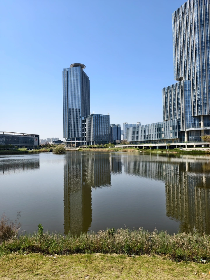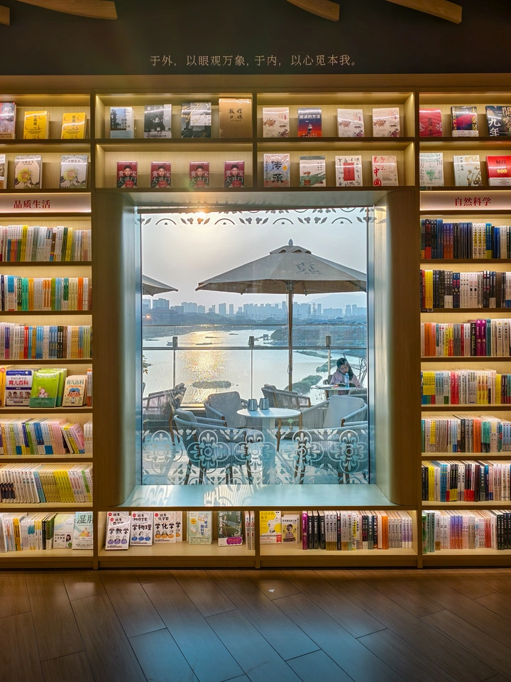 木质拱顶如时光隧道,两侧书墙延向远方。人们在书丛中穿行,有的驻足,有的沉思,在文字的森林里,寻找属于自己的那片星空。 书架围成一方天地,玻璃框住一汪春水。书页翻动的沙沙声,与湖面的粼粼波光在午后共振。有人在窗边静读,把城市的喧嚣,都隔在了书脊之外。