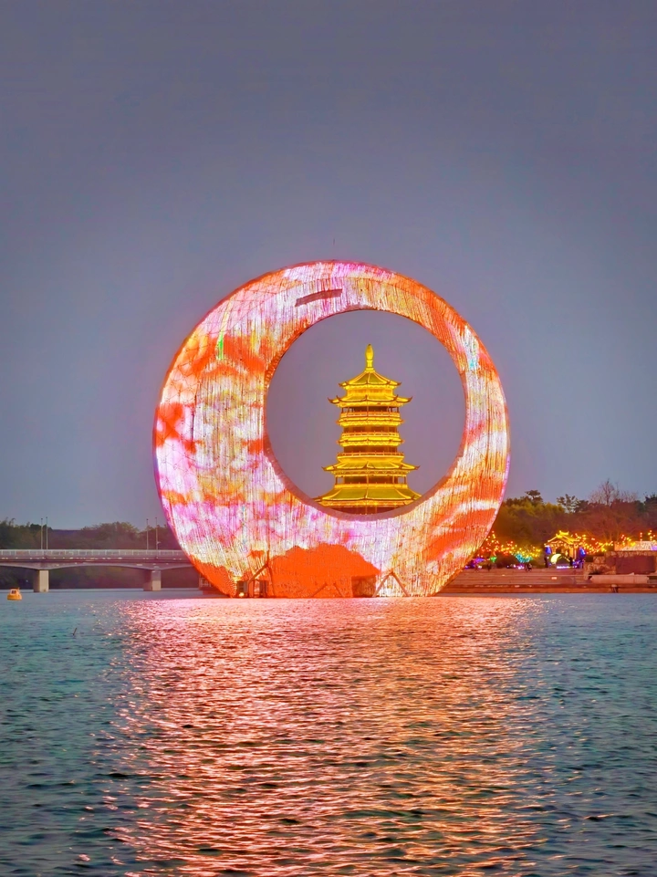 当巨大的环形灯盏亮起,金塔便成了这方天地的中心。它在水与光的中央,像一座被守护的信仰,也像一盏指引归途的灯。此刻,所有喧嚣都沉在水底,只剩这轮“月”,与塔尖的光,遥遥相望。