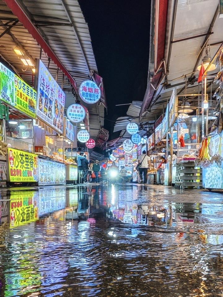 厦门的八市是个网红市场,入夜灯火辉煌。 雨后的地面,成了一面流动的镜子。 霓虹招牌的光,被揉碎在水洼里,随着晚风轻轻晃荡。 海蛎煎的香气混着湿润的空气,摊位前的人潮,是这座城市最鲜活的心跳。 我站在光影里,看夜色被霓虹染成斑斓的油画,每一道水纹,都藏着人间烟火的温柔。