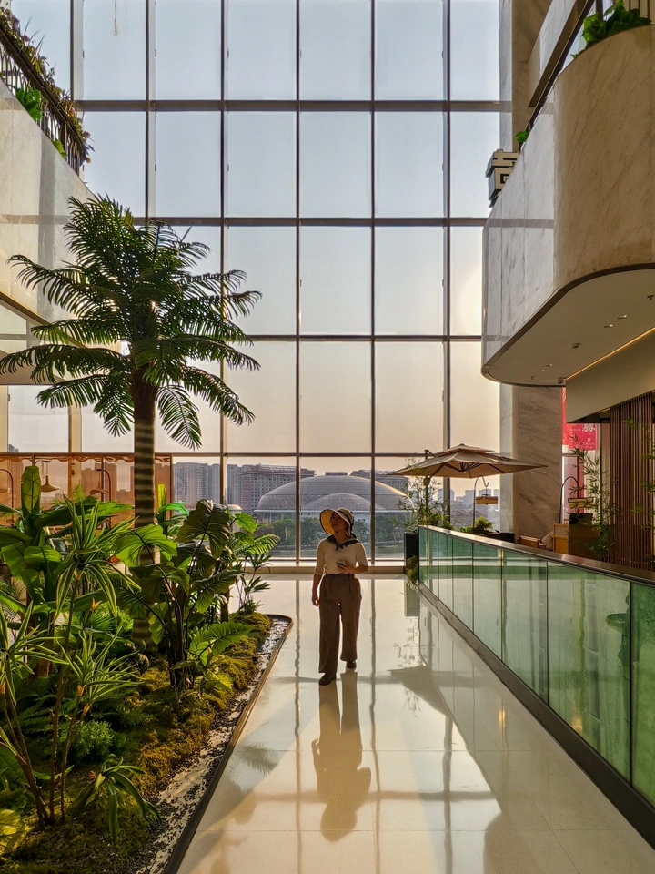 在巨大的玻璃幕墙前,阳光像融化的蜂蜜,流淌在光洁的地面上。我踩着自己的影子,仿佛走进了一个被精心安放的热带梦境。 窗外是熟悉的城市轮廓,而窗内,棕榈树与蕨类植物编织出一片绿洲。这一刻,都市的喧嚣被暂时隔绝,只剩下光影与绿意,在午后的时光里,温柔地交织。