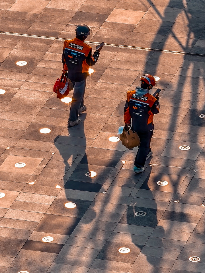 夕阳的广场上人来人往,不经意间我看到了两个同行的身影,如复制粘贴般:同样的制服,同样的低头,同样的左手拎餐,同样的右手持机,同样的步履匆匆。 在这个被光影切割的舞台上,他们不是过客,是用脚步丈量城市的人,把每一份订单,都变成一次温暖的抵达。