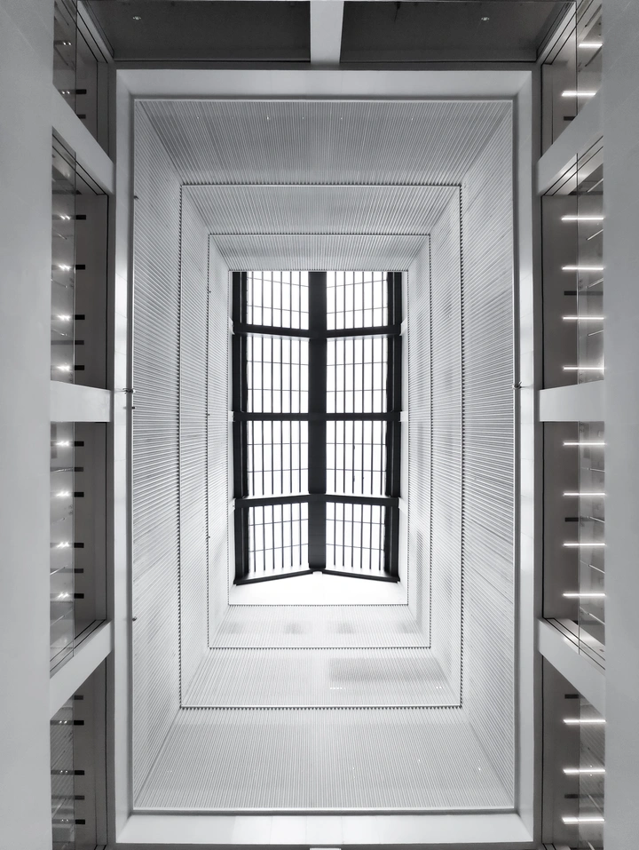 仰首望去,纯白的建筑内部化为一道深邃的峡谷。两侧是带有垂直线条的陡峭幕墙,向着顶部的光口无限延伸。阳光穿过天窗的金属网格倾泻而下,在层层平台边缘勾勒出分明的光影。黑白色调强化了这几何构成的纯粹与力量感。