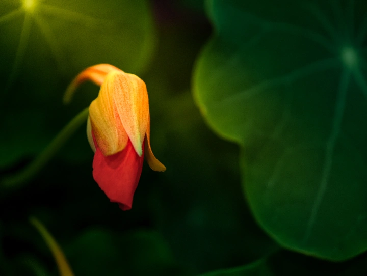 用vivo X300 Pro的微距模式凑近这枚旱金莲的花苞时,恰好撞见侧逆光穿过叶片的瞬间。暖光把花苞外层的橙黄瓣边镀上了一层柔光,纹理脉络在镜头下清晰得能数出纹路,而内层艳红的花瓣蜷曲着,像藏了一团未绽开的火,在深绿的叶片背景里撞出鲜明的色彩对比。背景的荷叶状叶片被虚化后成了墨绿的色块,只留叶脉的浅纹若隐若现,左上角的光斑散出星芒,给画面添了点朦胧的氛围感。vivo X300 Pro的微距解析力很惊喜,花瓣边缘的细微绒毛都被捕捉下来,让这枚待放的花苞多了几分鲜活的质感。蹲在花丛边抓拍的这几秒,像是撞见了自然最细腻的温柔,一朵花的盛放前奏,原来藏着这么多动人的细节。