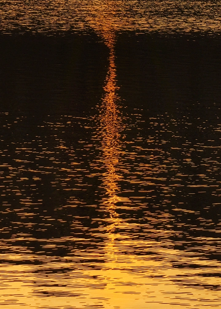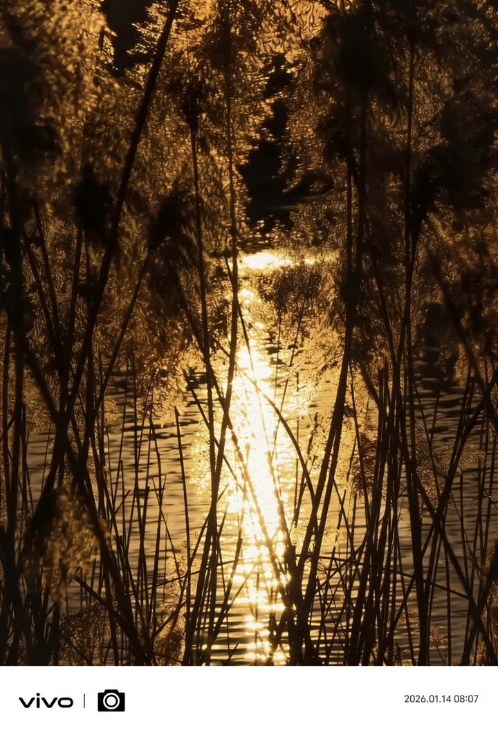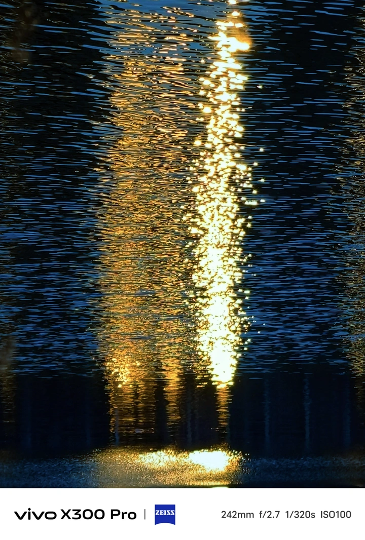 傍晚到湖边散步,刚好撞见落日贴近湖面的时刻,赶紧掏出vivo X300 Pro定格这一幕。镜头里,落日的光穿过水汽,直直地铺在水面上,被微风揉出的波纹扯成了细碎的金线,从湖岸一直延伸到远处的光影深处,像给黝黑的湖面缝上了一道金色的纹路。暗部的湖水沉得像墨,和亮得晃眼的金色波光形成强烈的对比,按下快门时特意用了长焦模式,把多余的景物裁掉,只留下这道纵向的光影线条,让画面的视觉焦点更集中。X300 Pro的色彩还原很准,把落日的暖黄和金橙都真实地保留了下来,连水波里那些细碎的光点都清晰可见。站在湖边看着这波光晃了好一会儿,觉得自然里的这些小美好,总能被手机轻易抓住,也是摄影最有意思的地方。