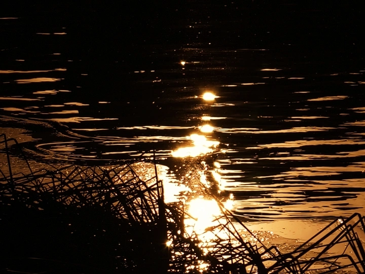 傍晚蹲在湖边,原本只是想拍一拍暗调的水面,却撞见落日的光最后一次落在湖面上的样子。光线穿透暮色,在黝黑的湖水里砸出一道亮得晃眼的金色光路,从远处的水面向我脚边铺过来,像撒了一湖的碎金。水纹轻轻翻涌,金色的光斑也跟着晃悠,有的聚成亮团,有的散成细屑,在深色的水面上划出不规则的纹路。前景的枯枝在光影里凝成黑色的剪影,和亮得发烫的金色波光撞在一起,冷硬的枝桠反倒衬得那片金光更柔软、更灵动。没刻意调整参数,就凭着感觉按下快门,想把这瞬间的光影留住。等拍完再看,才发现暗部的水面细节没丢,金光的层次感也被抓得很准,那些晃动的光斑像星星落进了湖里,明明是很普通的湖边一角,却因为这束光,成了独一份的风景。