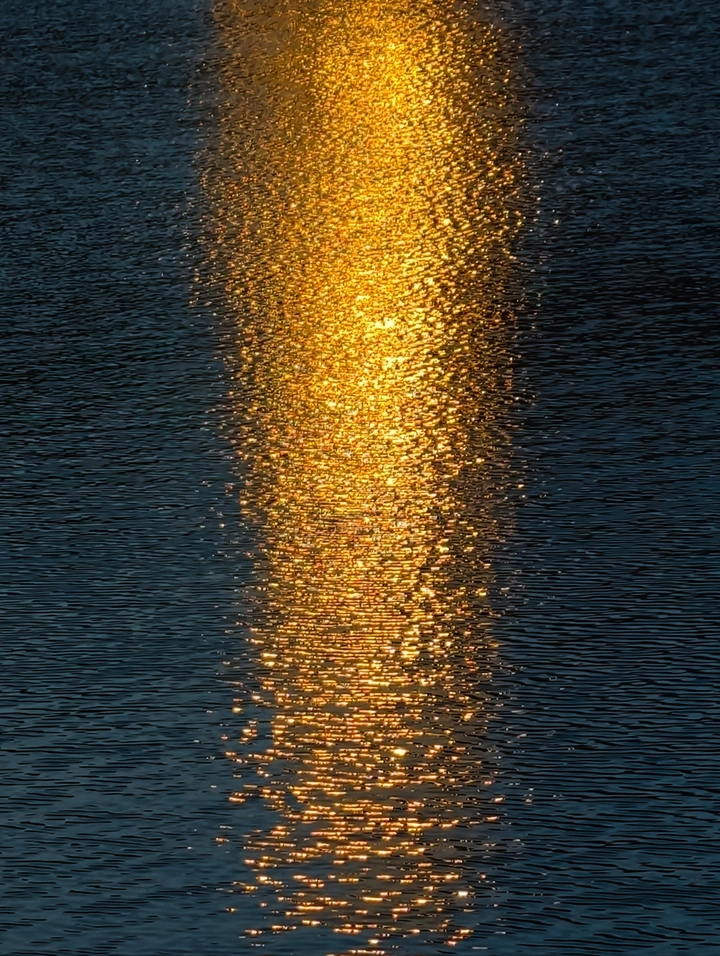 傍晚在湖边拍光影,看着水面的金光突然觉得像炸开的烟花。夕阳的光被水波揉碎,金色光斑一簇簇窜起来,从湖面直往上飘,没有火星和声响,却比真的烟花多了份温柔。用手机的长焦端把这些光斑拉近,深蓝色的水面当底色,金色的光点就像烟花的火星在暗夜里炸开。拍摄时风轻轻吹着,光斑跟着水波晃,每一帧的形状都不一样,就像烟花绽放的瞬间,抓都抓不住。拍了十几张才挑出这张,光斑的分布刚好凑出烟花绽放的轮廓。原来不用等节日的烟火,湖面的光影里,也藏着这样一场无声的烟花秀。摄影就是这样,换个角度看日常,就能发现不一样的惊喜。