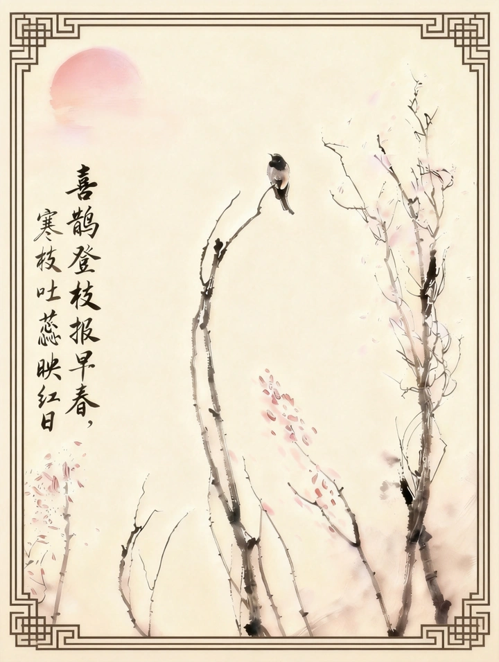 这幅《早春图》中,喜鹊立在枝头,仿佛在轻唤春天的到来。寒枝在微风中颤动,已悄悄生出花蕊,与天边的红日相映成趣。看着它,我仿佛能感受到早春那独有的气息,带着一丝料峭,却又满是希望。它让我明白,无论寒冬多么漫长,春天总会如期而至。生活也是如此呀,当我们觉得前路艰难时,不妨想想这幅画,告诉自己希望就在前方,那些美好的事物正踏春而来。