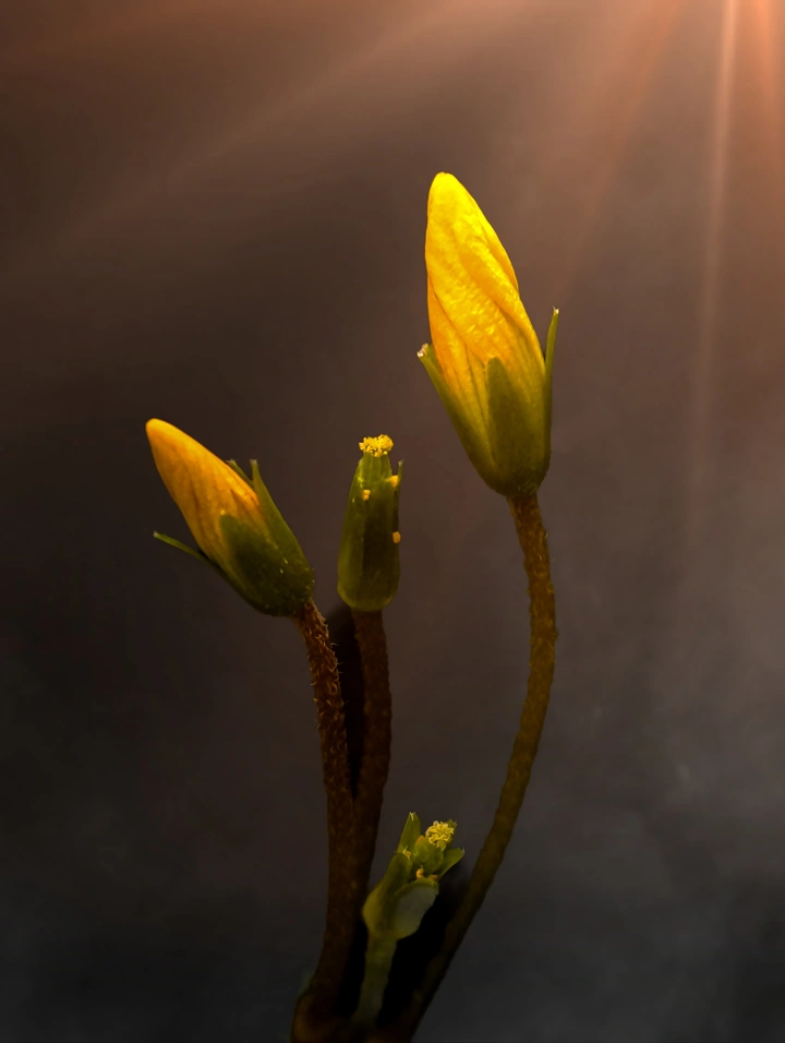一束光穿过暗调的空气,在花尖落下温柔的注脚。几枝待放的花苞还裹着青绿的外衣,内里的金黄却已迫不及待地透出光来。最挺拔的那一支,像攒足了力气要去触碰光源;旁边稍矮的花苞,也在悄悄舒展着柔软的瓣尖。它们不疾不徐,在属于自己的节奏里积蓄着绽放的能量。摄影于我,从来不是捕捉盛开的瞬间,而是等待与看见。看见那些尚在酝酿的美好,看见暗夜里依然生长的渴望。就像这束光,它不只是照亮了花,也照亮了镜头后那个愿意静下来的自己。我们总在追寻耀眼的结果,却忘了每一次绽放,都始于花苞里的沉默生长。愿我们都能像这些小花,在属于自己的光里,慢慢舒展,静静盛开。