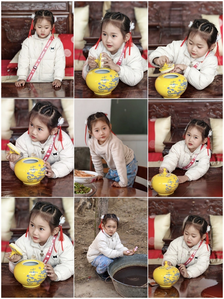 初五的阳光漫过红木案几,明黄的龙纹瓷罐静卧其上,像一捧凝固的金。小外甥女俯着身,指尖轻触罐盖,眼神里满是对“宝藏”的好奇。流苏在鬓边轻晃,红与黄的撞色里,是年的热烈,也是童年的纯粹。她不知道这罐子里装的是糖果还是福气,只知道此刻的专注,足以让整个午后都变得温柔。镜头定格的瞬间,传统的纹样与稚嫩的脸庞相遇,像一场跨越时空的对话——老物件里藏着岁月的厚重,而孩子的眼里,装着整个春天的希望。在这个丙午马年的开端,愿她永远保有这份对世界的好奇,把每一份遇见,都当作值得珍藏的礼物。