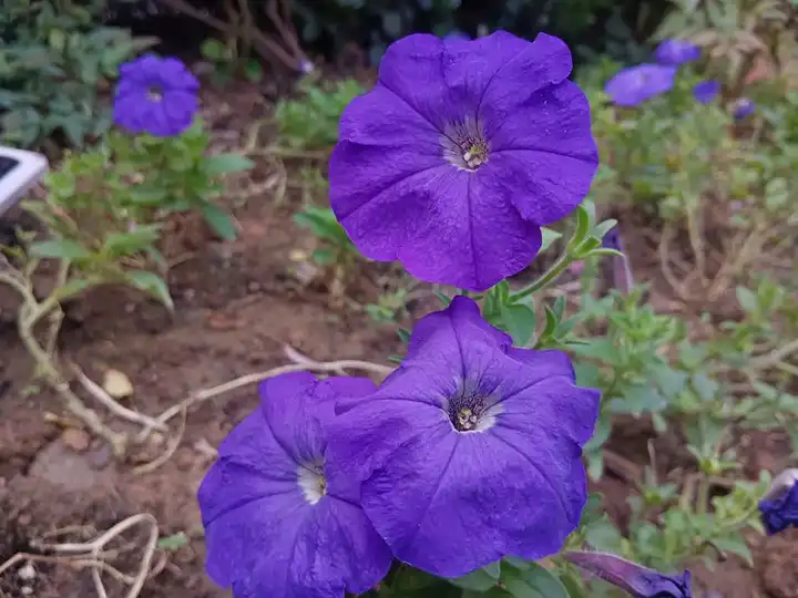 花园的泥土间,几簇紫色矮牵牛正编织着梦幻的织锦。那紫,浓得化不开,一朵朵喇叭花或昂首、或依偎,花瓣上的纹理似是时光的褶皱,中心的花蕊如细碎的星子,在紫幕里闪烁。