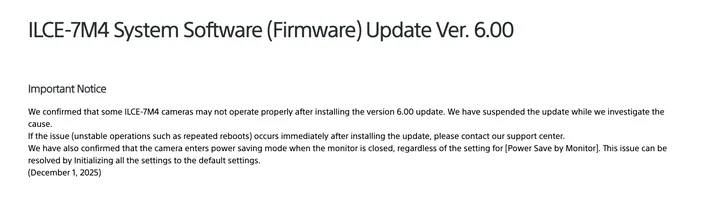 此前索尼推出A7M4的Ver.6.00版本固件,但部分用户反馈升级后相机出现异常。目前索尼海外官网已暂停该版本固件推送并着手调查问题原因,国内虽暂未发布相关公告,预计也将于近期跟进。海外官方通知内容如下:
