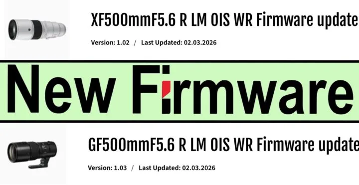 【富士GF/XF500mm F5.6固件更新!】 富士推出适用GF500mmF5.6 R LM OIS WR与XF500mmF5.6 R LM OIS WR镜头的最新固件。本次更新主要修复了开机后镜头防抖问题,具体更新内容如下: ▪️修复相机开机后(或在省电状态下唤醒),防抖功能无法立即工作的问题。 如需了解详细固件升级内容及下载对应固件,请前往富士官方网站查询。