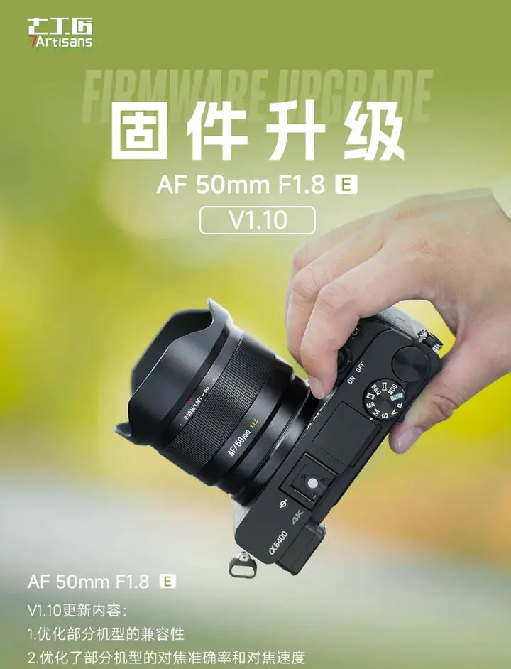 近日,国产光学品牌七工匠为LITE系列两款E卡口APS-C画幅镜头推出最新版本固件,本次固件优化了镜头与机身的兼容性问题以及镜头的对焦速度。具体更新内容如下: