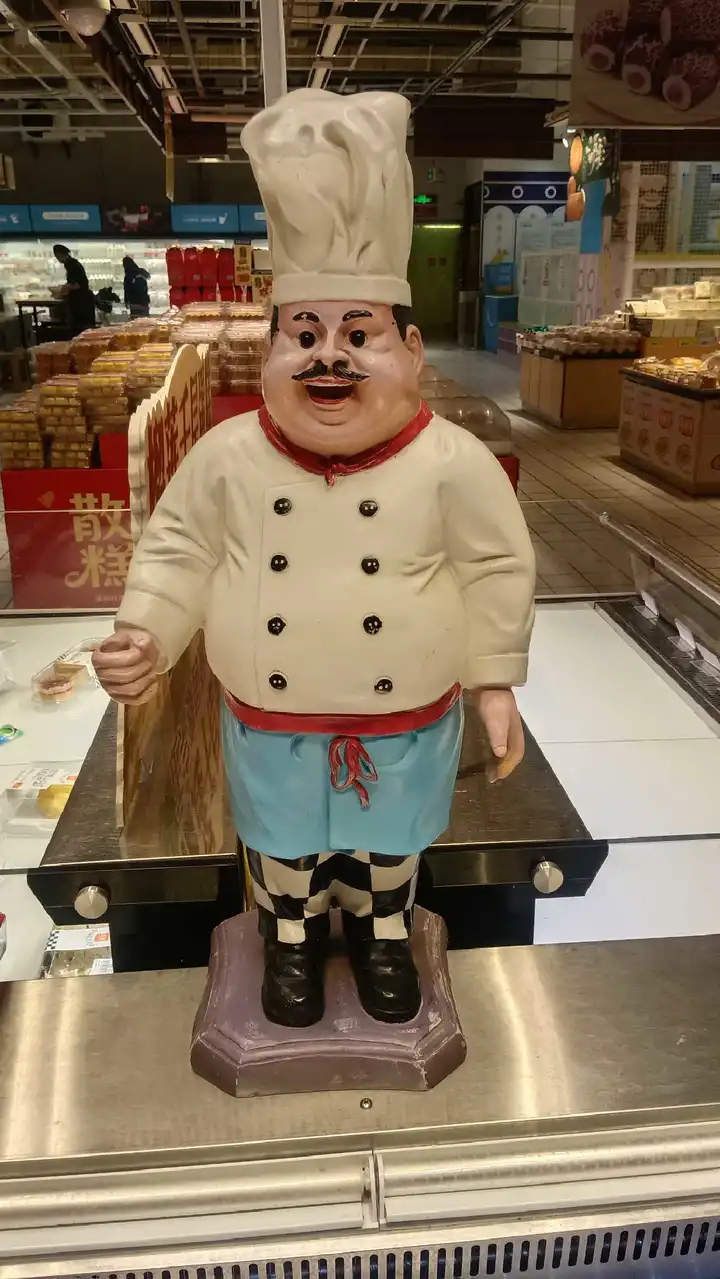 明明是塑料雕的身,偏揣着活泛的热乎劲儿——仿佛下一秒就要挥着胖手喊:“刚出炉的糕,趁热尝!” 超市的冷光撞在他油亮的笑脸上,都软成了暖调。