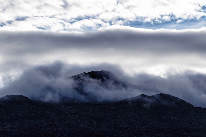 《雾锁山魂》:“雾锁”强调了云雾对山体的笼罩,“山魂”赋予山以灵魂和精神内涵,暗示着山在云雾中依然有着独特的魅力与气质。 这幅作品构图采用“天地分割”式布局,厚重云层横亘画面中上部形成天然分界线,下部山体以深灰剪影托举云雾,仅留顶部山尖刺破云层,构成“藏与露”的视觉张力。云层的流动线条与山体的硬朗轮廓形成动静对比,右下角隐约的山岩纹理增添画面纵深感。色彩以黑白灰为基调,云层受光面呈亮白,背光处渐变为靛蓝,山体的墨黑与天空的淡蓝形成微妙层次,单色系统中蕴含丰富灰度变化。 情感层面传递出苍茫与敬畏,云雾的缥缈与山体的沉雄形成精神对话,观者能感受到自然伟力带来的震撼与谦卑。主题上通过“云遮山隐”的意象,探讨表象与本质的哲学关系——被云雾遮蔽的山体暗示着未知与永恒,而穿透云层的山尖则象征着真理的显现。 艺术价值在于将气象景观升华为抽象表达,摄影师以极简手法捕捉瞬间光影,让云的流动感与山的稳固性在静态画面中形成时间隐喻。黑白影调的运用剥离了色彩干扰,直指自然的原始力量,这种“少即是多”的创作理念,使作品兼具东方水墨的写意精神与西方极简主义的理性思考,在虚实变幻间引发对存在本质的深层叩问。