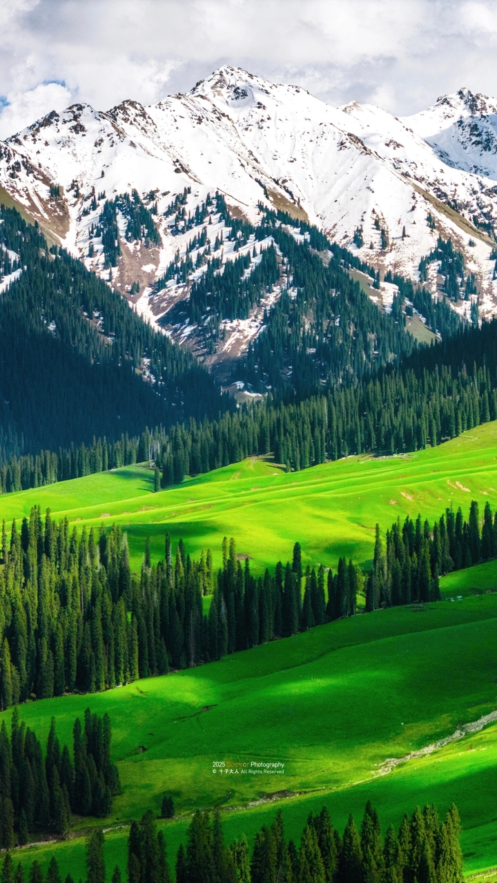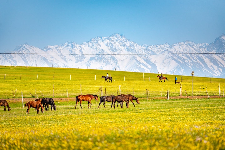 这组作品拍摄于新疆伊犁巩留。画面中,广袤绿野繁花似锦,牛羊马群悠然觅食,牧民骑马驰骋。远处雪山皑皑,与蓝天绿野相映成趣,奏响一曲自然和谐的田园牧歌,尽显伊犁独特的草原风光与生机。