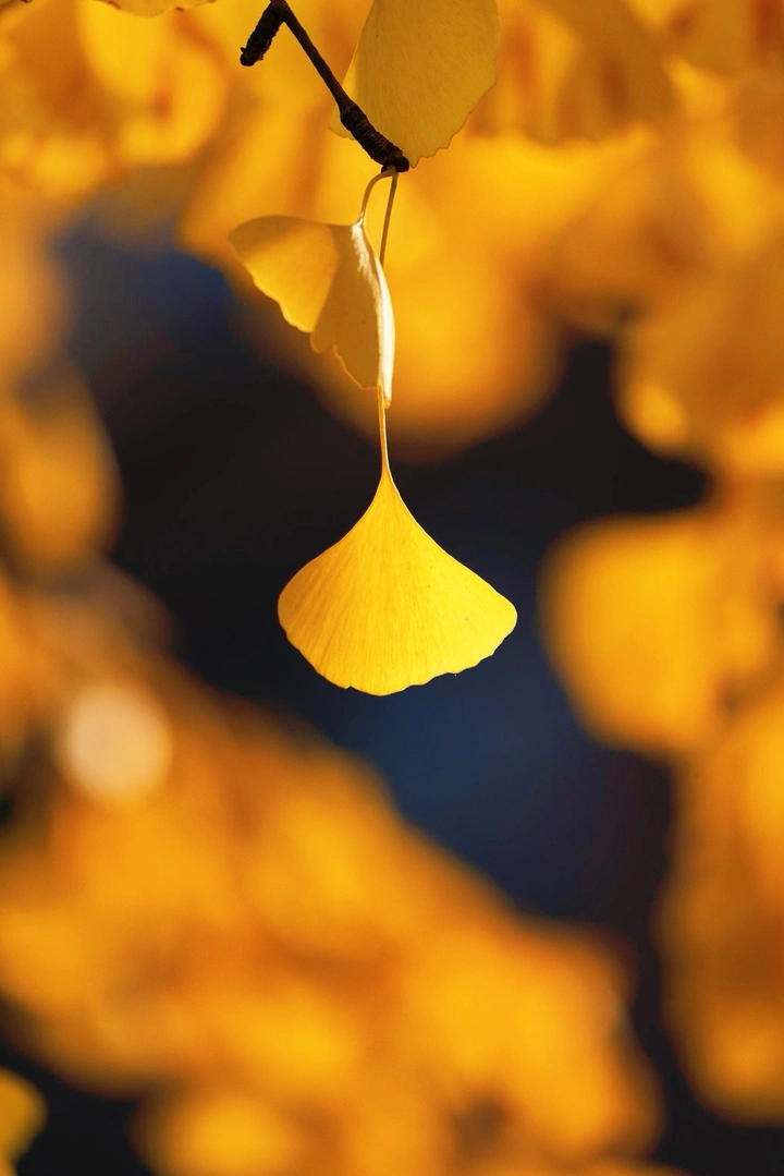 秋染银杏,叶坠成金。 一枝摇黄,半盏凝光。 风催叶舞,岁碾年长。 拾片藏黄,揽缕秋阳。