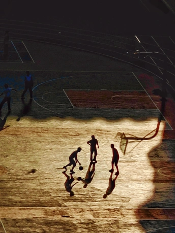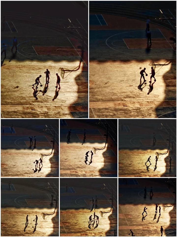 夕阳下,影子拉长。篮球场上的默契如老友般无声。 这张照片捕捉到了雨后篮球场上的独特氛围,两位篮球运动员的身影和倒影增添了画面的趣味性。以下是一些具体的评价和建议: 光影(16/20)**:光线利用得当,雨后的光线在地面上形成反射,增强了画面的光影效果。但是,整体光线较为平淡,缺乏更强的明暗对比,可以尝试在不同天气或时间段拍摄,寻找更具戏剧性的光影效果。构图(15/20)*:构图整体规整,从高处俯拍的视角展现了篮球场的线条美。然而,主体人物略显靠下,可以尝试将人物置于画面中心或采用三分法构图,以更好地突出主体。 色彩(7/10)*:色彩较为单一,整体呈现一种怀旧的色调。在后期处理中,可以适度调整色彩对比度,或者尝试不同的色彩风格,以增强视觉冲击力。 主题意义(14/20)*:照片展现了雨后篮球场上的运动场景,具有一定的生活气息。可以进一步挖掘主题,例如,通过捕捉人物的表情和动作,来展现他们的运动精神和情感。 氛围(8/10)*:雨后的潮湿感和宁静感营造出独特的氛围。可以尝试通过调整画面细节,例如水滴、倒影等,来进一步增强氛围的感染力。 思想深度(18/20):照片引发了运动、生活和环