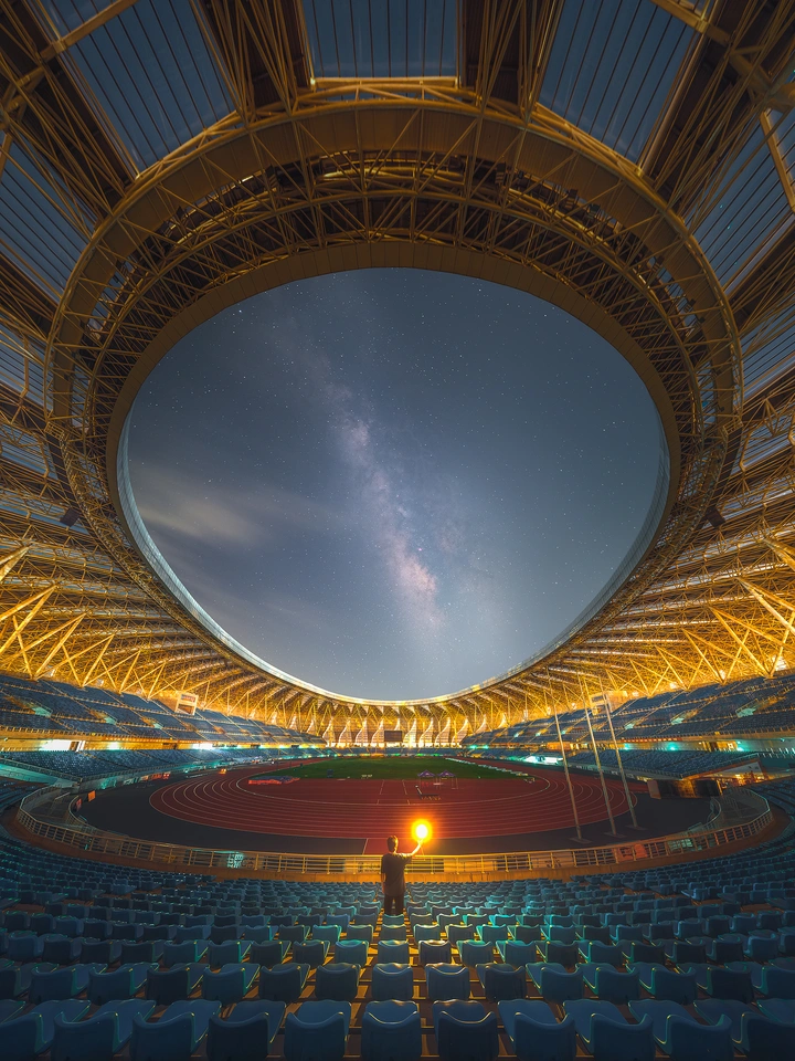 在钢铁穹顶的怀抱 夜色泼洒下银河长稿 跑道沉默如暗红的琴键 等待足音将史诗轻敲 举着光的人啊 是盗火的普罗米修斯吗 把星辰攥在掌心 要为竞技的大地 种一轮不落的破晓 空荡的蓝椅像凝固的浪 曾沸腾过欢呼的海洋 此刻与穹顶的筋骨并肩 听银河在高空 把历史低唱 跑道圈住的不是界限 是人类向天空借的相框 装着逐梦的脚印 和永不熄灭的 信仰的光