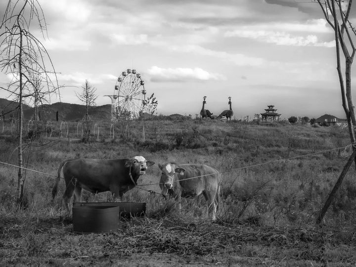 废弃的花海与游乐园,在风与草的低语中退场。曾经的喧嚣被萧瑟吞没,色彩归于苍茫。这是一场被荒野呼唤的回归:从热闹到静寂,从人工到自然,牛群悠然,旧迹渐隐,秩序将由自然重写。