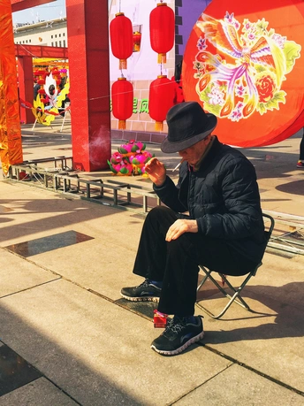 《灯会上》 一老者,独自坐在灯会的一角,默默的晒着太阳抽着烟,感觉就象自家的窗户下面,悠闲自在的与灯展无关。