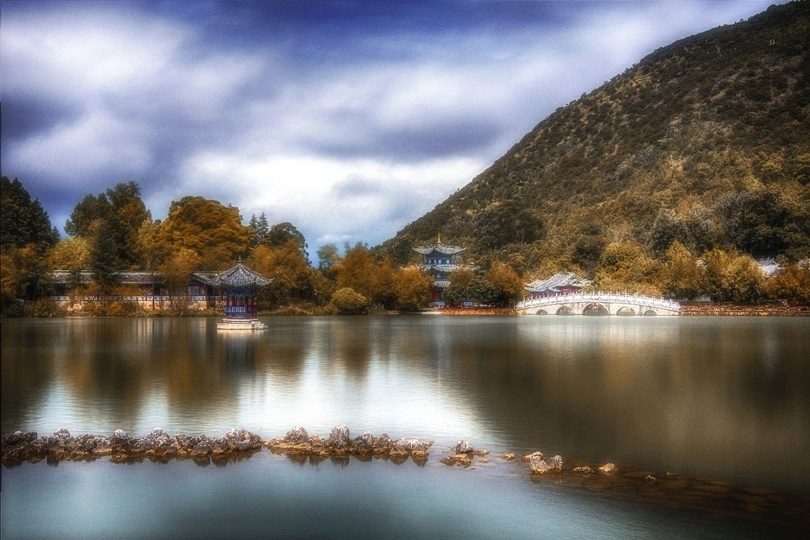 黑龙潭秋色,摄于云南丽江黑龙潭公园,等了一上午云层都没散去,遮住了后面的玉龙雪山