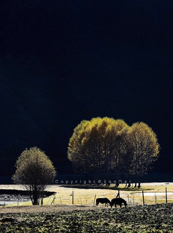 金晨,新都桥深秋季节的一个清晨,阳光金子般撒在大地上,马儿悠闲自在地吃着阳光早餐!