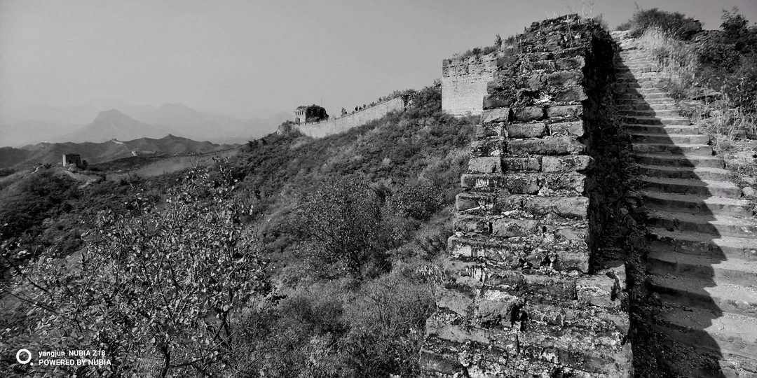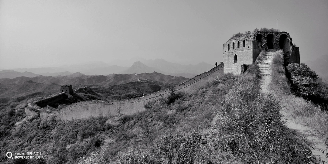 十一黄金周第五天,行走在北京密云古北口蟠龙山长城——一段所有开放的长城中唯一一个未经人工修葺而保持了其历史原貌的古长城上。这回用努比亚Z18手机的黑白模式拍摄了一组长城照片,与彩色片相比黑白影像更增加了长城的厚重感,Z18黑白模式在作品的明暗对比、文理细节的表现上还是令人满意的