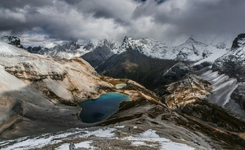 图片描述:拍这张照片的时候,我正背着相机登山,由于是在高海拔地区徒步登山,每爬一小段距离就得停下来休息。也许是老天看我虔诚给我机会,就在我登上半山腰转过身正准备坐下休息的时候,发现阳光穿过云层中的间隙照射在海子周围,我便快速的拿起相机记录下了这一瞬间。