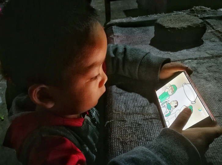 现在这个手机时代,对人类影响很大,从娃娃开始就接触,甚至离不开它!2018年11月24日傍晚,使用华为手机拍于云南省巧家县。