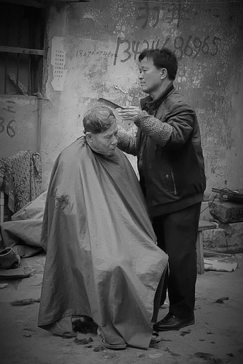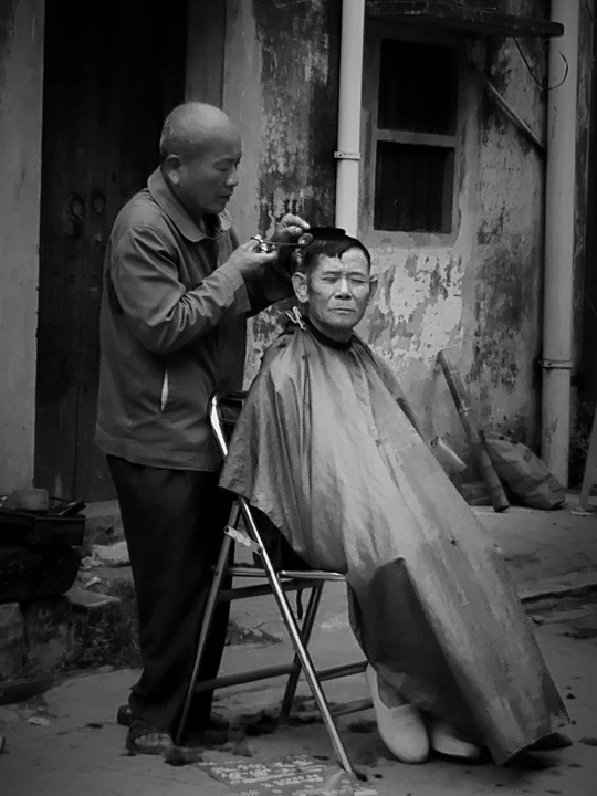 闹市中的街头手艺人,算是老一辈的Tony老师,服务的对象几乎都是老爷爷老奶奶,有时也会有几个哭闹的小孩子,不染不烫不洗,只剪头发和修脸,过年10块钱一位,平时5块钱。 早上七点钟就骑着单车到大家平时工作的位置,两张椅子拉开就开始剪,中午就吃自带的鸡蛋和包子,下午三四点集市散了他们也开始转移阵地,到人家家中去帮那些年纪大了行动不便的老人剪头发