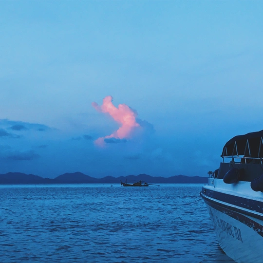 翻出两张昨年去普吉旅游的作品 记得当时黄昏时分,在海边的烧烤吃着晚宴。落日余晖还未完全消退,仅剩朵朵留恋着黄昏的云彩,只见其中一朵神似郑和的独影矗立在一帆孤舟之上跨越时间的长河来到此地直视现实的游轮。而现实的游轮也遥望着古老的孤帆。一切的一切都在变。不一会……一切都消逝了……