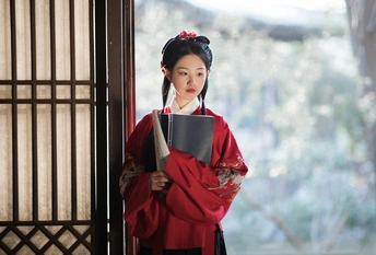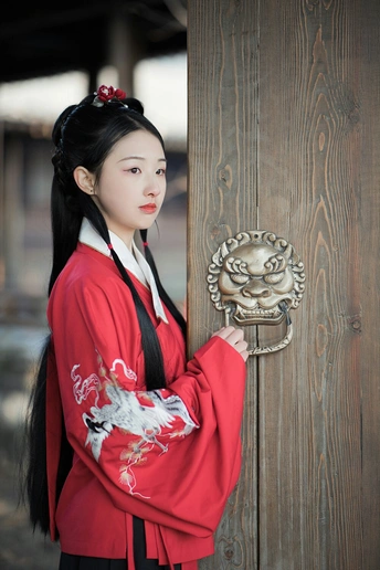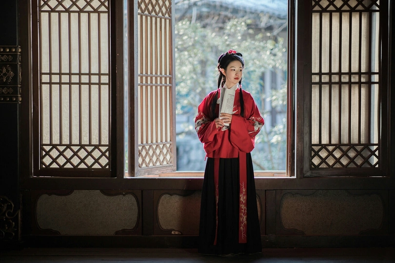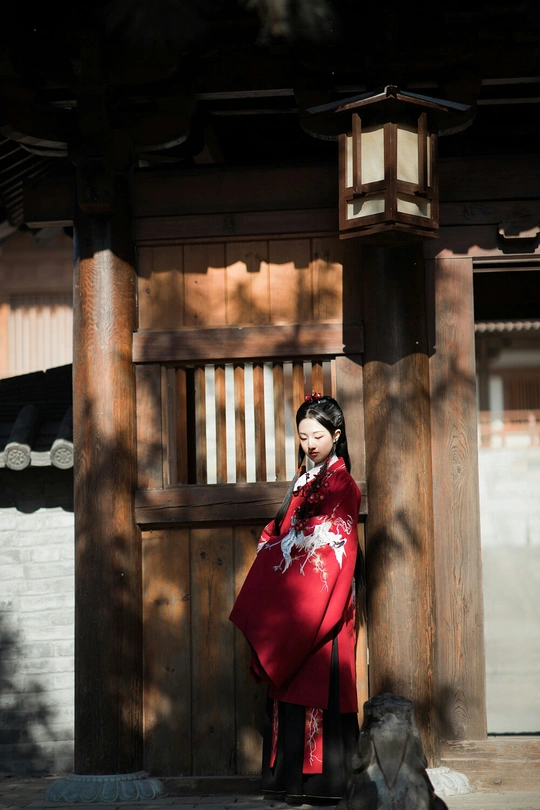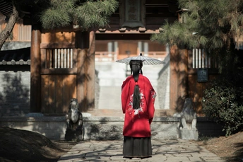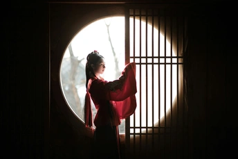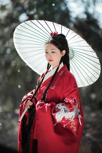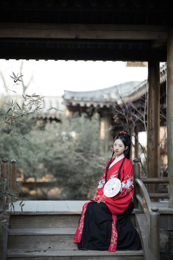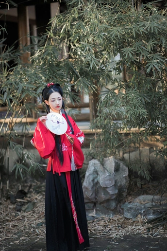 孤庭松影映宅深, 陌上青石云隐帧。 红衣黑裳绘白扇, 偏是姑娘伞下文。