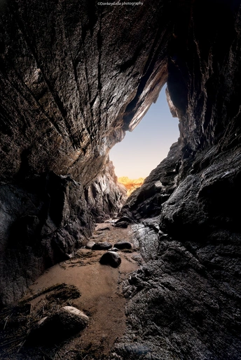 《无人山洞》 洞外暖腻的斜阳,洞内清凉的浮光。 无人山洞,摄于温州竹屿岛,在大草坪以北的礁石群之中,礁洞约二三十平方,纵身十几米,岩壁渗水,洞顶不时有水滴。潮水给洞内带来大量的海草(可食用)和贝类生物,洞外发现海参、海胆、寄居蟹等。