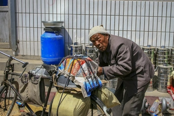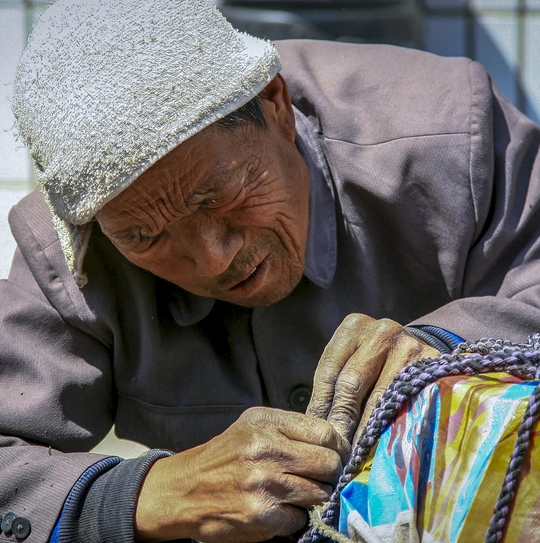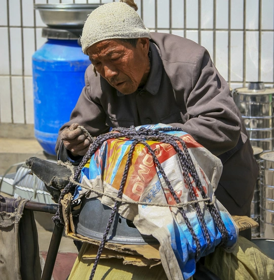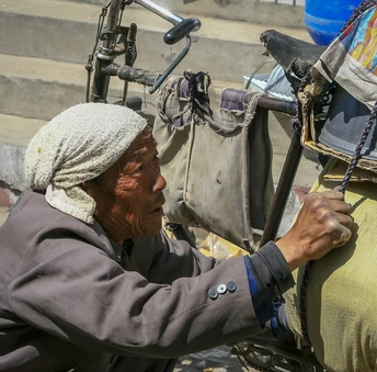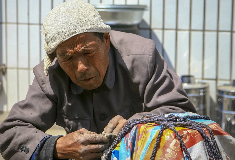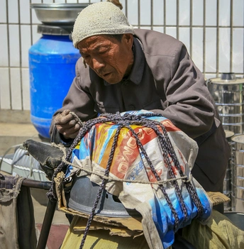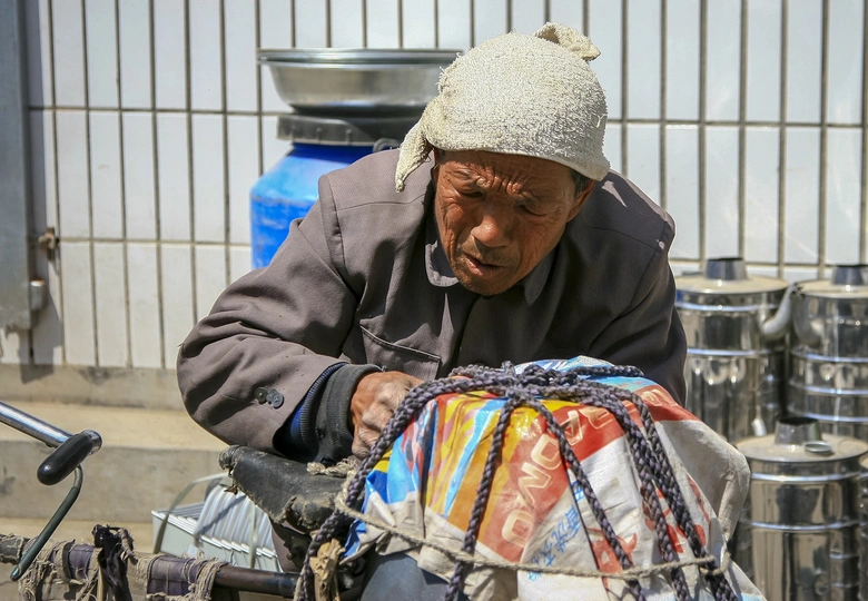 2009年4月,在河北平山县行车途中,因遇到集市堵车偶遇一位在日杂店买东西的老农,正在他的自行车后捆绑物品。他头戴传统的白毛巾,神情极认真地打捆他买到的东西。我忽然就想起来彭丽媛唱的那首《父老乡亲》,想到了标志性头巾的陈永贵原副总理。如今,十年过去了……