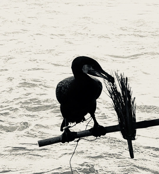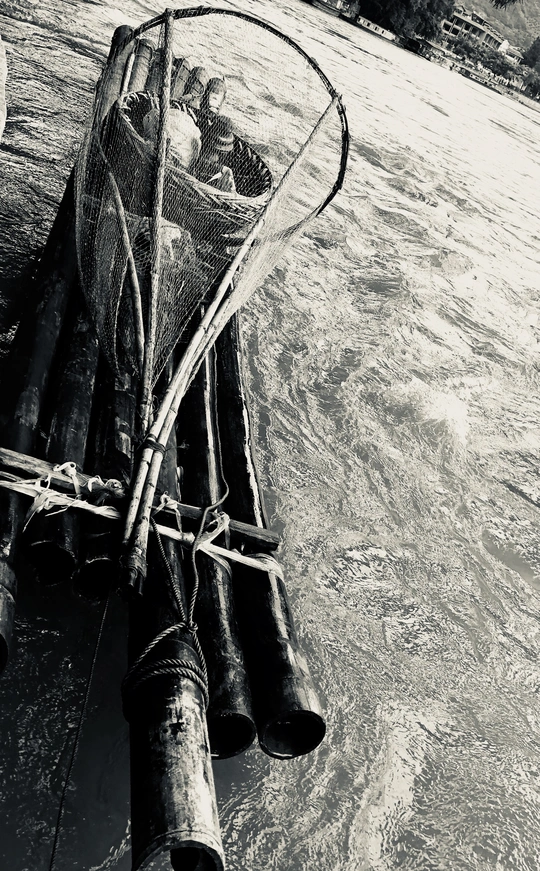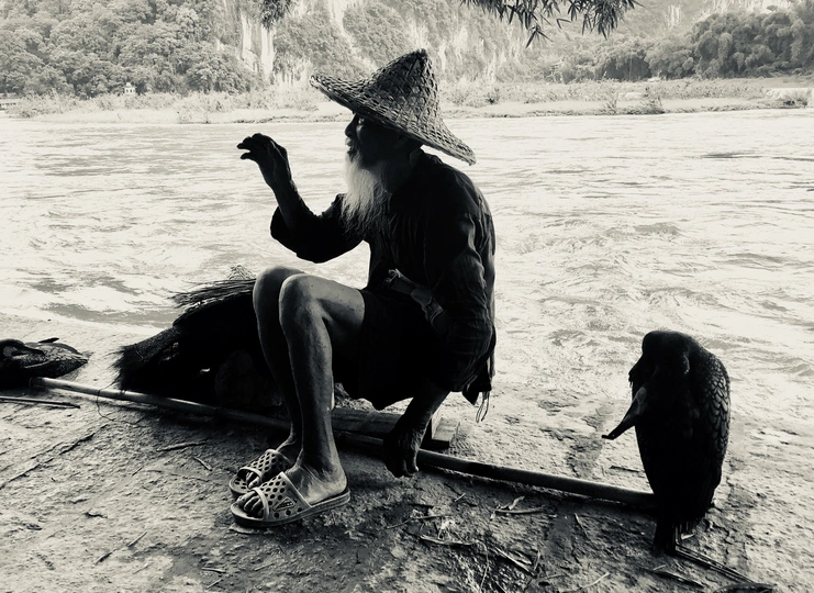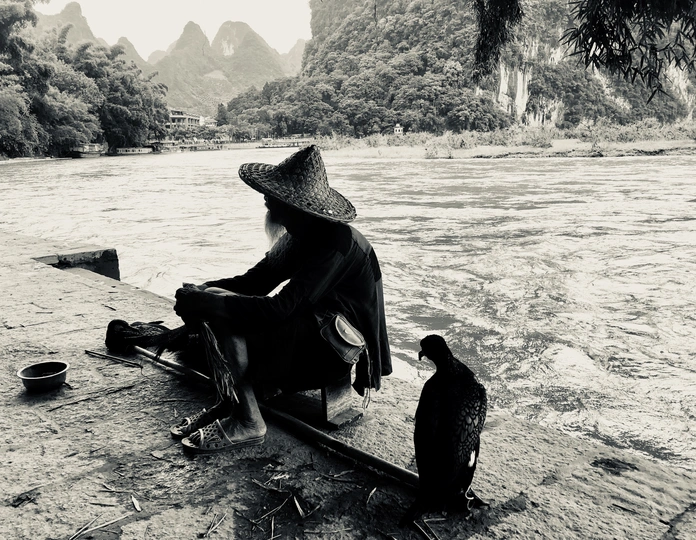 大家肯定都不陌生,漓江上这位戴着斗笠和蓑衣,带着鱼鹰,点着灯,撑着小船的老人。很多摄影师专程为他而来,拍出来的好片子,不计其数。但是我今天见到的老人,嶙峋瘦骨,双手抱着膝盖独自坐在江边,看着这些游人来来去去,旁边还是那两只鱼鹰,旁边的漓江上淌着他的小船,里面的灯,水壶,渔网都清晰可见。游人来来去去,我在旁边盯着他看了一阵,不敢上前。突然抬头,看清他的模样,其实就是跟我爷爷年纪差不多大的老人,年迈的皱褶,暗黄的皮肤,还有花白的胡须,让我莫名心酸,不知所措的跑了。留下这几张偷偷拍的样子。老人,鱼鹰,小船和漓江。