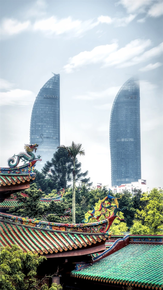 出差去厦门,逛到南普陀,在后山看到画面,极具现代感的世茂大楼与传统建筑同框,融合到一起,很有意思。