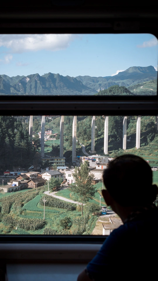 会家的途中,窗外是连绵不绝的山峦,火车在隧道里、桥梁上穿梭。