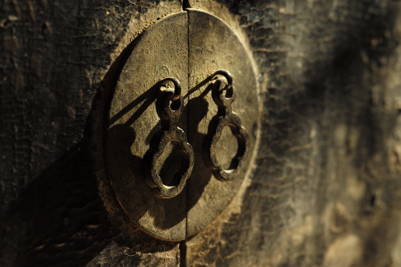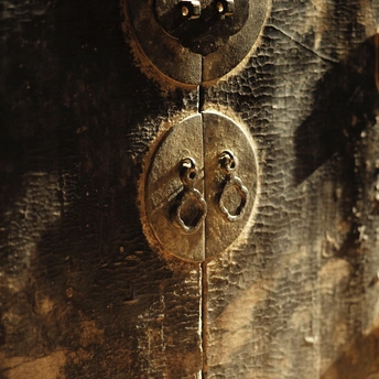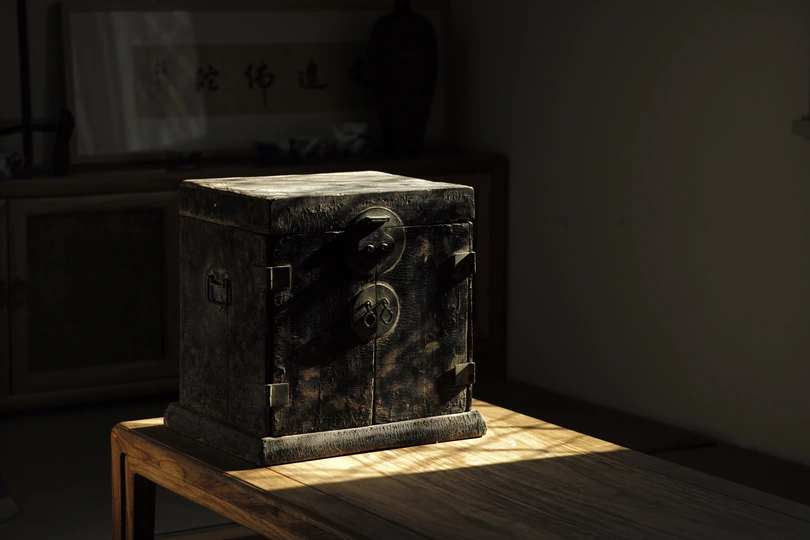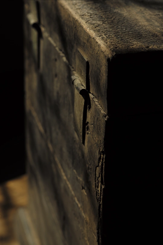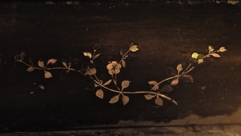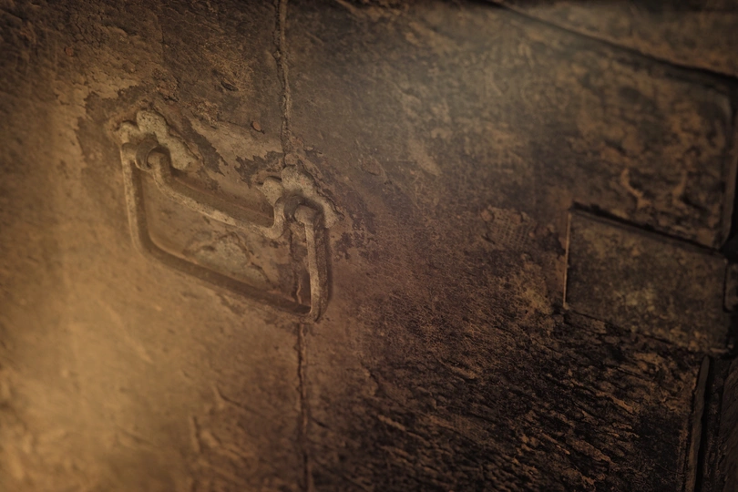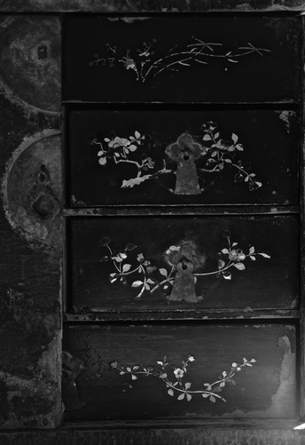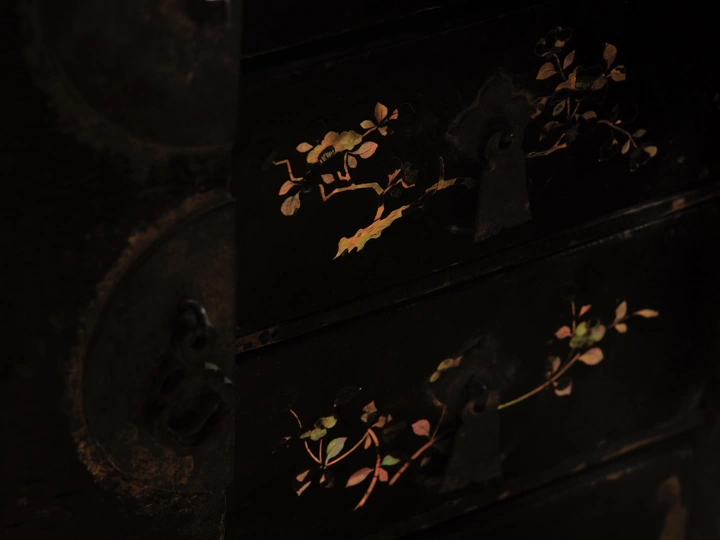 整体内外均为木胎大漆嵌螺钿工艺,工艺极其复杂。 目前箱体外部的螺钿基本都脱落了,但从漆面痕迹仍然清晰可辨,原始四角洒螺钿,中心画片嵌螺钿,画面布局精细,细节刻画颇为精美。 内部抽屉面板嵌螺钿保存相对完整,散射光下的蛤蜊光依旧光彩照人。