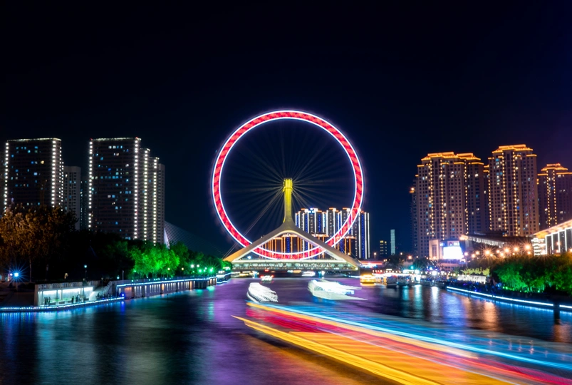 拍摄于天津之眼摩天轮。因为到天津眼时时间太晚,无法亲自登上天津眼,在顶点一睹天津城市夜景。提前有查资料了解到天津眼隔壁不远的金钢桥是天津眼不错的观赏点。来到金钢桥果然桥上人头攒动,不少人也在桥上拍摄。我注意到偶尔有江上邮轮经过,可以形成漂亮的流光。但邮轮频率比较低,想前期拍好比较完美的流光比较困难。在经过一个多小时的尝试,最后一张成功得到较为理想的流光。之后邮轮停运,再无流光。