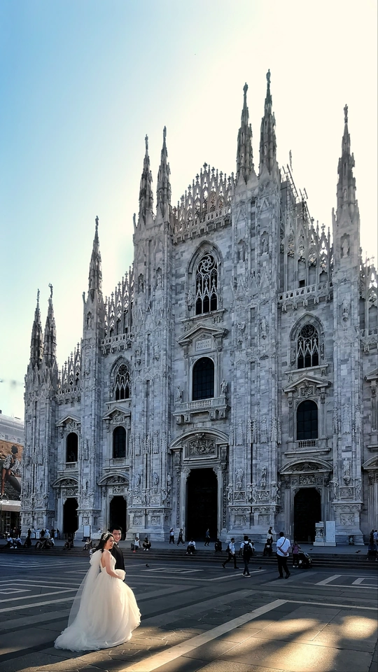 洁白的婚纱掩映着新娘娇媚的笑脸,笔挺的西装衬托着新郎幸福的甜美。一对新人在米兰大教堂前幸福温馨一刻。
