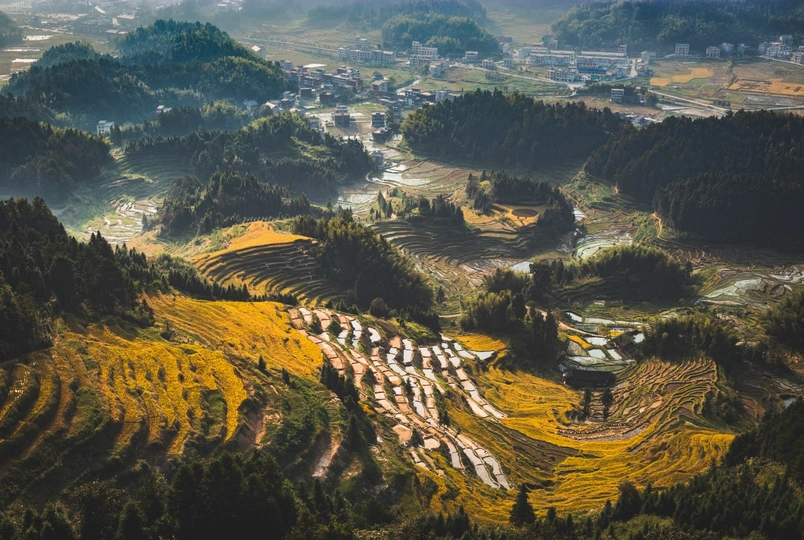 娄底紫鹊界八卦冲梯田金秋时节,稻田丰收,一片金黄。@米拍