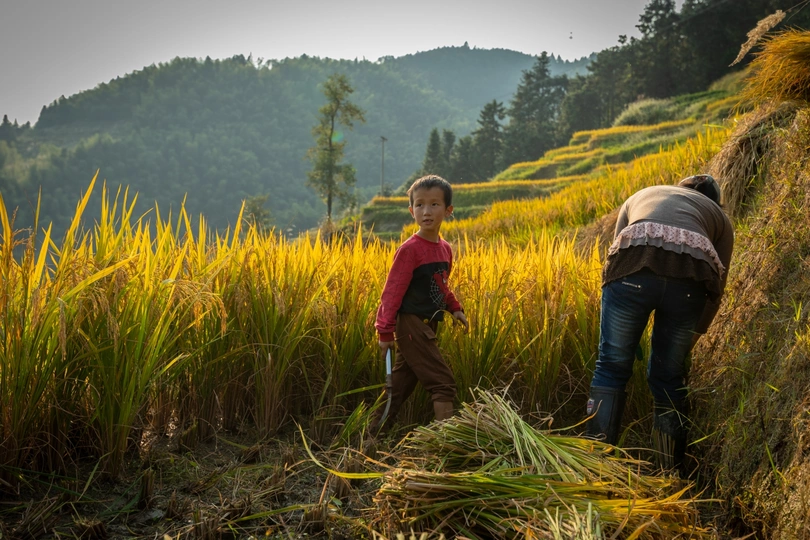 金秋时节娄底紫鹊界梯田一片丰收景象,妈妈带着孩子一起割稻子。