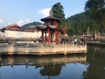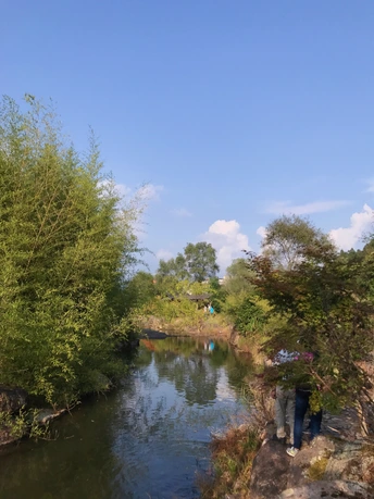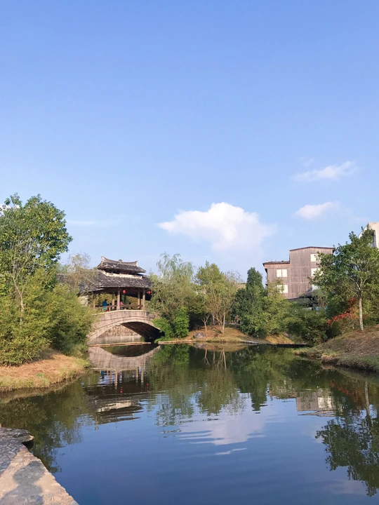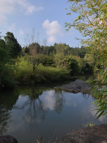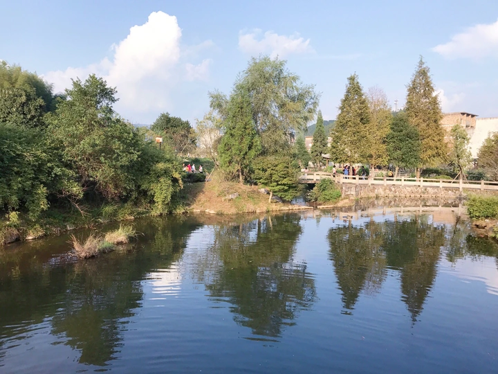 “臻人性,知人情,识人趣”,福建周宁县鲤鱼溪两岸风光。茂密长长的竹林衔着洁白的云朵,在蜿蜒曲折的溪中投下了翠绿和云团, 像一幅山间画卷镶嵌在清澈的溪水里,随着水库溢出的落水慢慢地涌动浮闪。下游处,溪道宽广。水中的亭台廊阁在水一方,采纳着天边的日月精华,温婉秀丽。石拱桥横亘水中央, 一边是亭亭玉立的少女化身,一边是四只跃跃欲跳的鲤鱼围绕着一只大鲤鱼追逐嬉闹的场景。小孩童趴在大鲤鱼身上愉快地玩耍。静静的鲤鱼溪,写照着当地人的民俗,风情,和他们对幸福美好生活的追求。