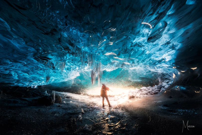 在经历了冰岛环岛西北部的暴风雨后,到达东部,我们全副武装的在瓦特纳冰川探索了几个小时后,最终到达这处蓝冰洞。在没来冰岛之前就对蓝冰洞非常的向往。我们在2018年也拍摄过俄罗斯贝加尔湖的蓝冰洞,但是这两者真的完全不一样,瓦特纳的蓝冰洞是这么的大,这么的蓝。
