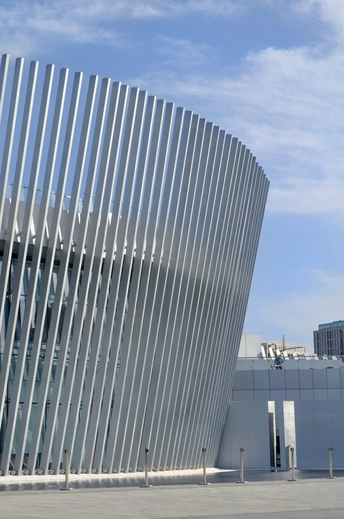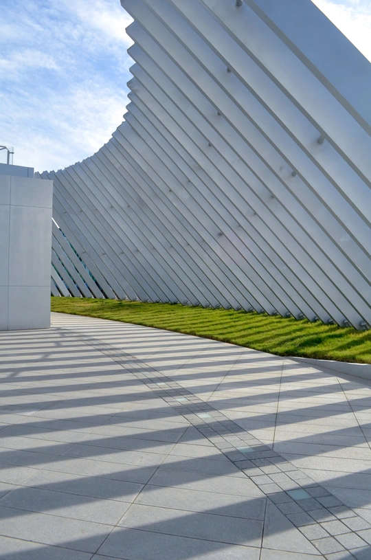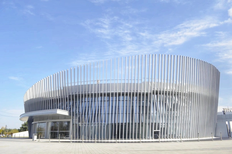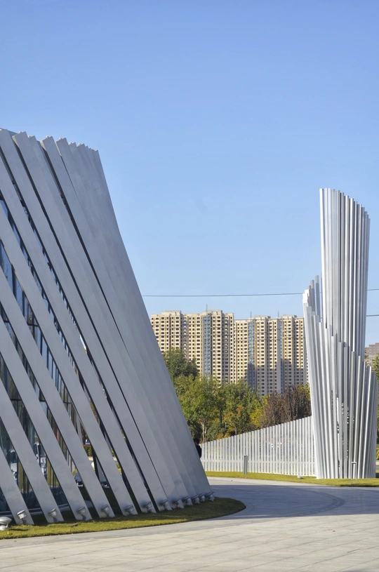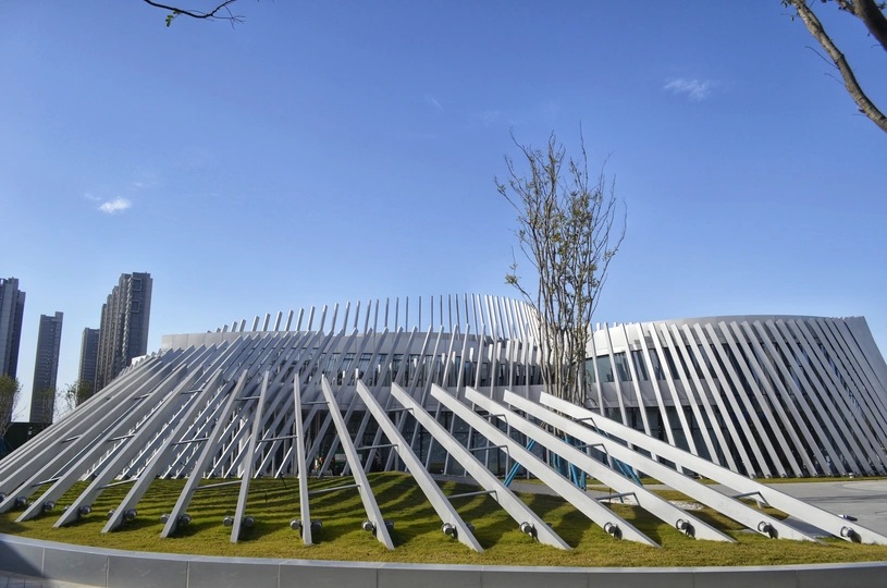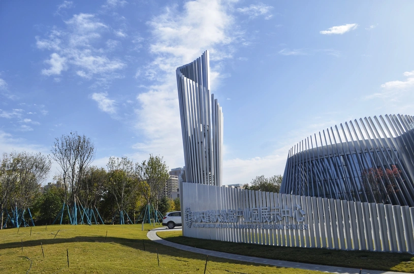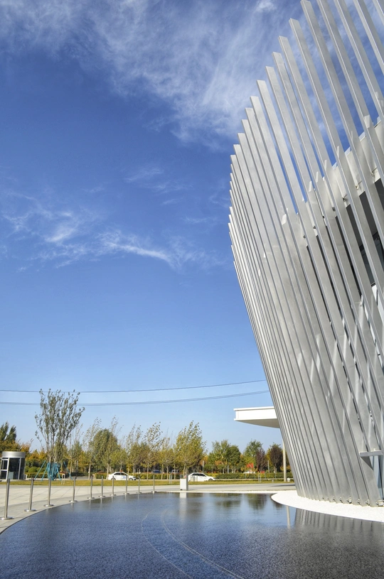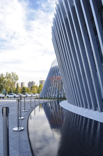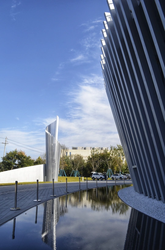天健湖对面的大数据展示中心,整体的金属银色在蓝天白云下格外有韵律感