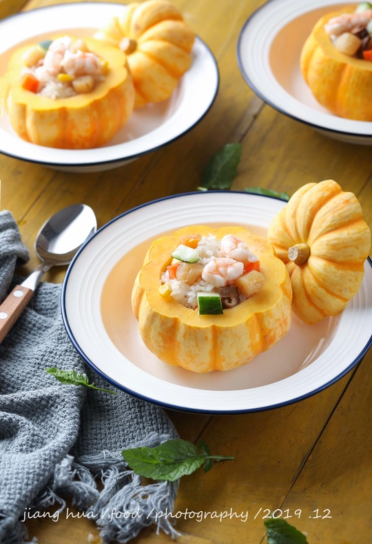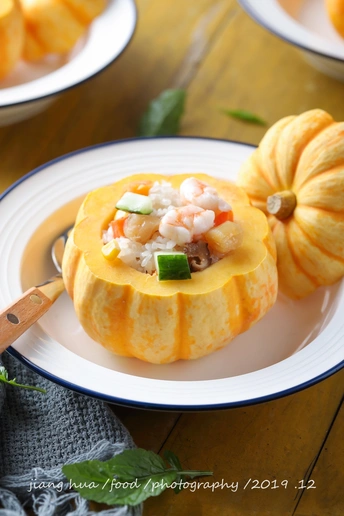 自己做的,取糯米加火腿,瑶柱,虾仁,冬菇,玉米粒等蒸制而成,用小南瓜做容器